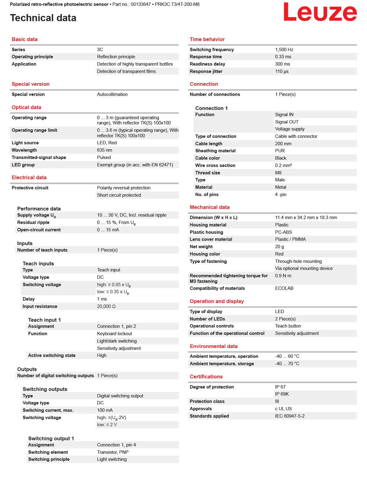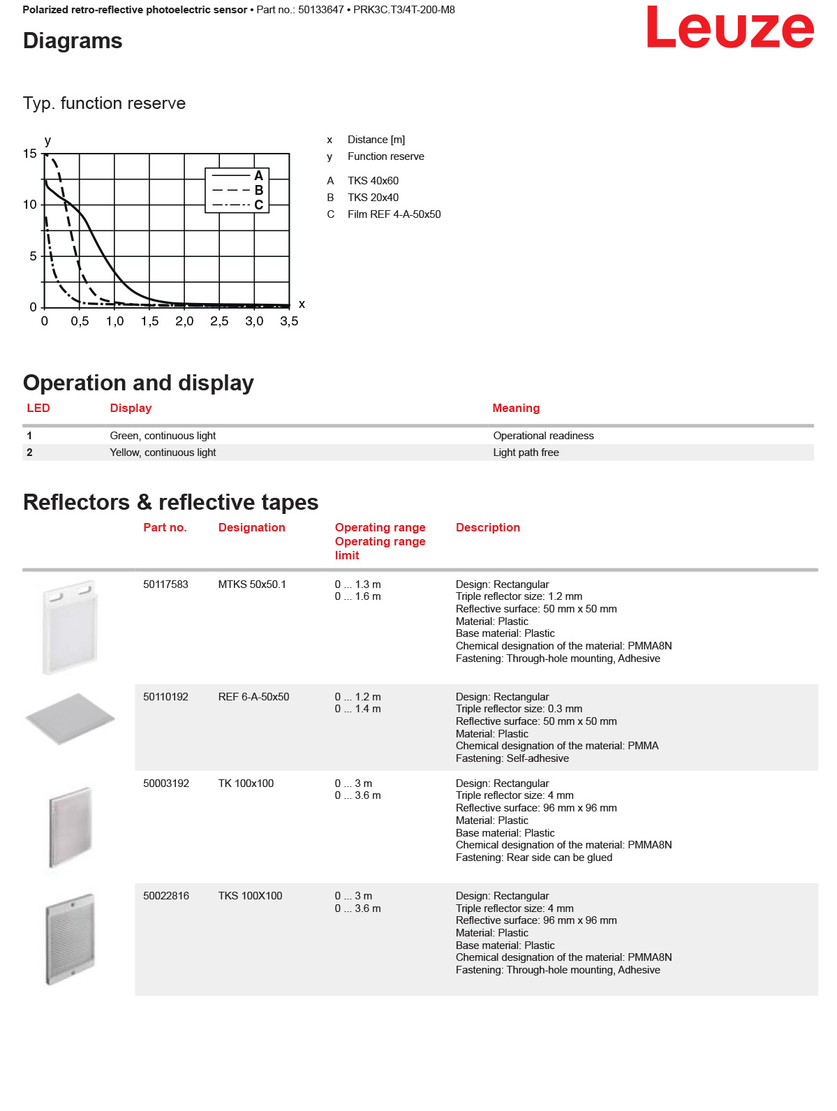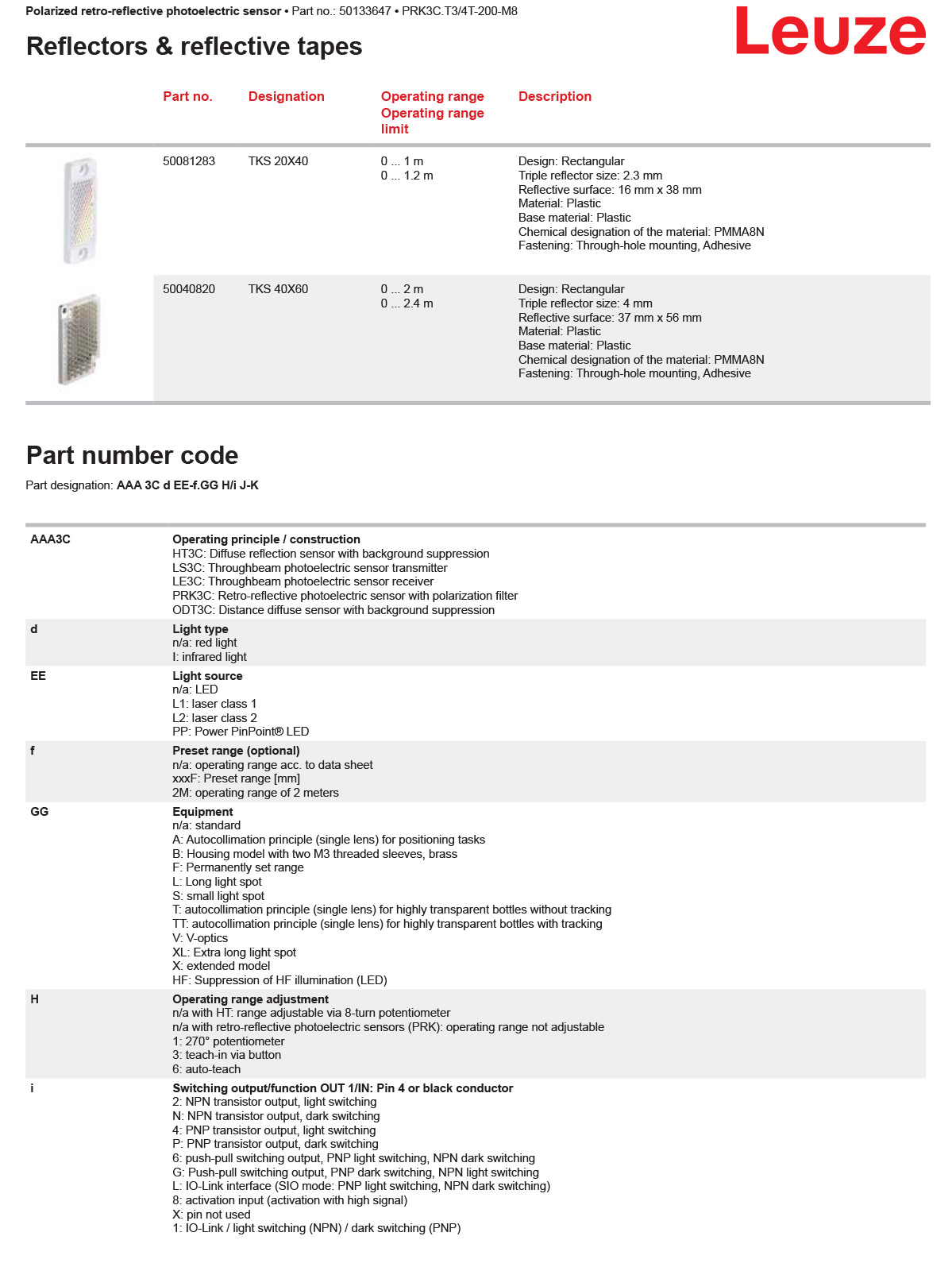 德国LEUZE劳易测 PRK3C.T3/4T-200-M8 带偏振光片镜的镜反射型光电传感器